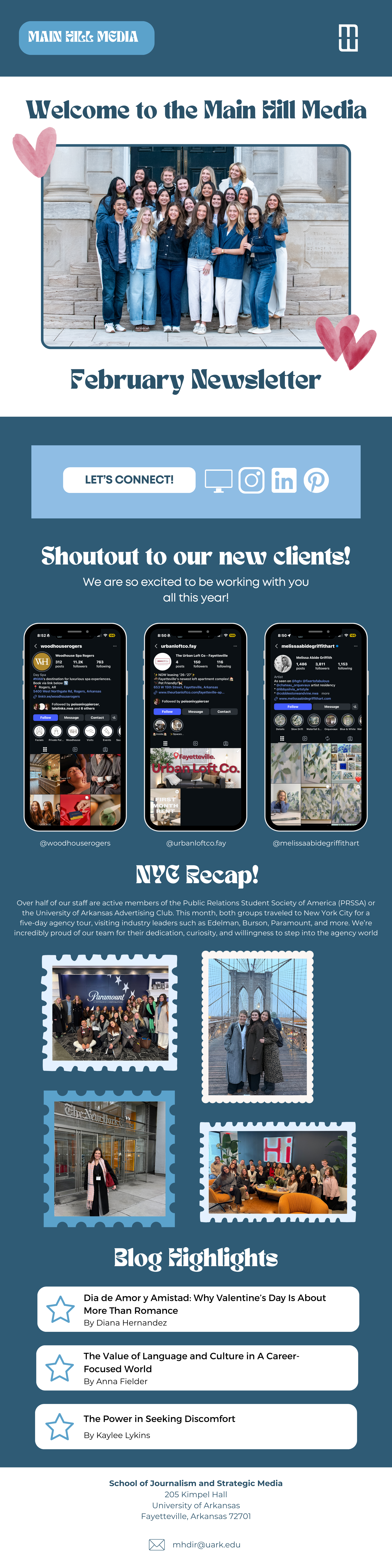 I lead content strategy and oversee editorial calendar for weekly blog posts on agency website, aligning topics with current campaigns, industry trends, and exciting events around Northwest Arkansas. I write and edit engaging, SEO-friendly blog content to elevate agency visibility and showcase student work. I analyze blog performance metrics to optimize future content strategy and improve audience engagement, and design, write, and distribute a monthly digital newsletter sent to clients and industry partners, highlighting key projects, agency milestones, and upcoming opportunities.
